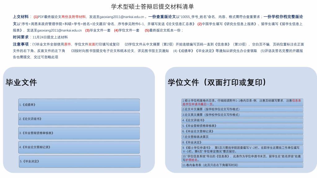 研究生答辩结束后需要及时准备各种毕业及申请学位的材料,学术型硕士生和博士生需要提交的材料清单分别如下: