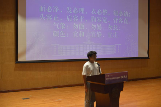 随后,叶宏途同学作为2023级本科生代表,引领全体新生齐声诵读南开容止格言,其声铿锵有力,响彻礼堂。这不仅是对学子们外在仪态的规范,更是南开精神内涵的深刻体现,寄托了对每位学子内在修养与高尚品格的殷切期望,激励他们内外兼修,共筑辉煌南开梦。最后,304永利集团2024年迎新大会在悠扬的校歌声中圆满落幕。