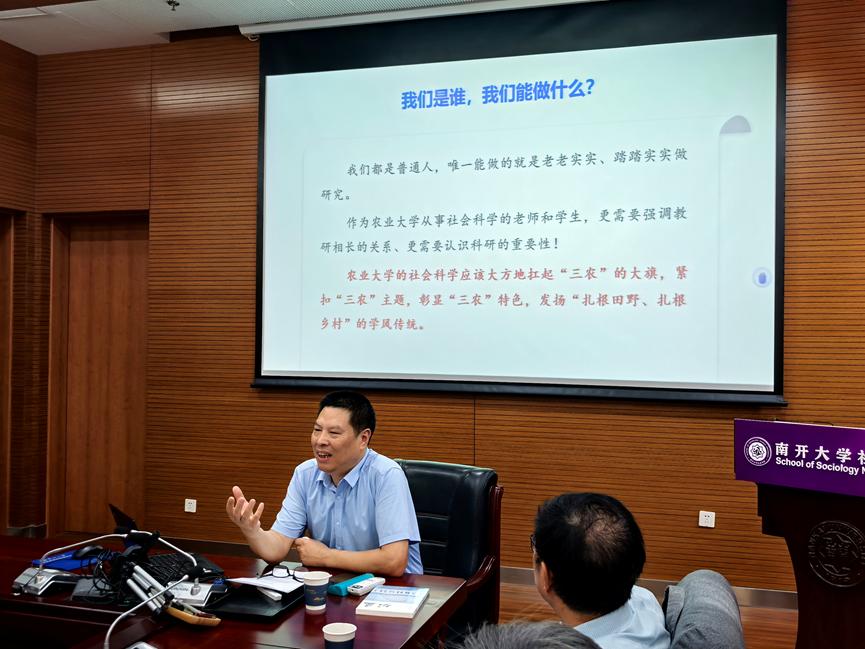讲座伊始,叶敬忠教授明确指出社会研究本质上是一种经验研究。他强调从事社会科学的师生不仅需要强调教研相长的关系,更需要深刻认识科研的重要性。叶教授特别提出,作为农业大学的社会科学应该发扬“扎根田野、扎根乡村”的学风传统。随后,叶敬忠教授回顾了2000年后自身深入田野乡村的一系列调研经历,这些研究涉及农村留守儿童、农民视角的新农村建设、农村留守人口问题、农村留守妇女、农民视角的乡村振兴、乡村发展与转型定点试验等多个方面。他分享了在这些调研过程中积累的丰富经验和深刻认识,并介绍了在这些领域发表和出版的一系列重要研究成果。