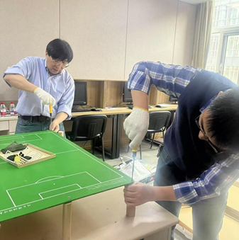 在活动正式开始前,辛千凡教授提前一小时来到304永利集团津南校区,与社会心理学系张阔老师一起组装设备,为员工们亲手打造一个方便可及的室内“迷你绿茵场”。