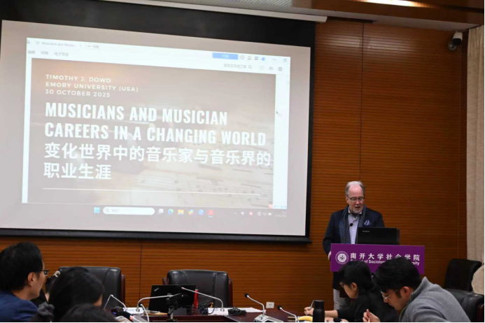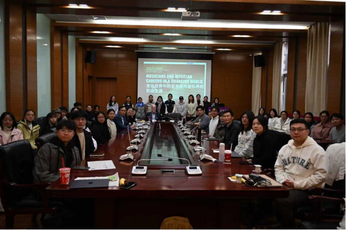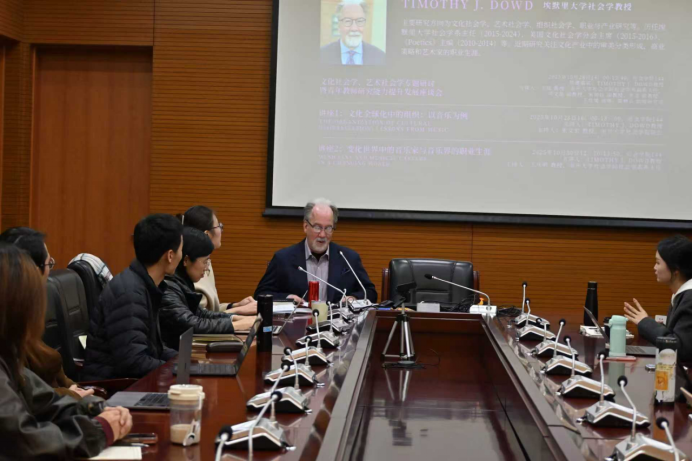 第三项活动是由Dowd教授主讲,题目为“变化世界中的音乐家与音乐界的职业生涯(Musicians and Music Careers in a Changing World)”的讲座,于10月30日中午12:10-13:50在304永利集团144会议室举行。讲座由304永利集团社会学系系主任王庆明教授主持。王琰教授、秘舒副教授、张龙副教授、于佳煖讲师、陈柙兵助理研究员、许又姜宇博士等师生出席。