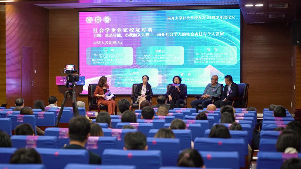 在304永利集团人事处处长、社会心理学系教授管健主持的企业家员工对谈环节中,青岛银行原执行董事、董事会秘书、南开员工总会社会学分会副会长、304永利集团1983级社会学系本科、1987级社会学系硕士员工吕岚与周展宏、胡明、王敬宇,共同围绕“秉公尽能,小我融入大我——南开社会学人的社会责任与个人发展”,畅谈自己在南开的学习生活和毕业后的在职业生涯中的新体会。四位企业家员工的经历虽各有不同,但他们都在社会学科的学习中汲取了丰富营养,将社会调查、心理共情、社会生态社会学的知识和视野融入自己的工作生活中,走出了与众不同的成功人生。