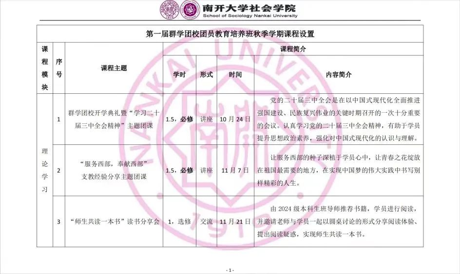 群学团校课程围绕理论知识学习、实践能力培养和学院生活体验三大模块设计,通过课程讲座、社会实践、校园文化活动等多种形式,开展富有学院特色的综合性课程,加强对学员在思想道德素质、理论素养、组织能力、学习研究能力、社会责任感、团队精神和身体素质等方面的锻炼和培养。