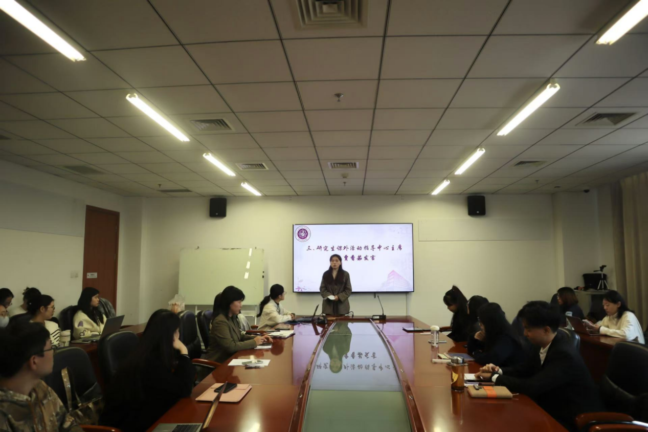研究生课外活动指导中心主席团成员衣起麟代文体部部长王琛旭汇报,文体部根据员工需要为大家准备了各式各样的文娱、体育活动,加强员工体育锻炼,丰富员工的课余生活。